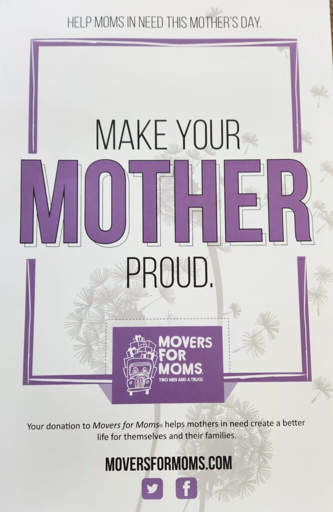 Place your items inside the large box labeled “MOVERS FOR MOMS” located at the back of each church this weekend.
