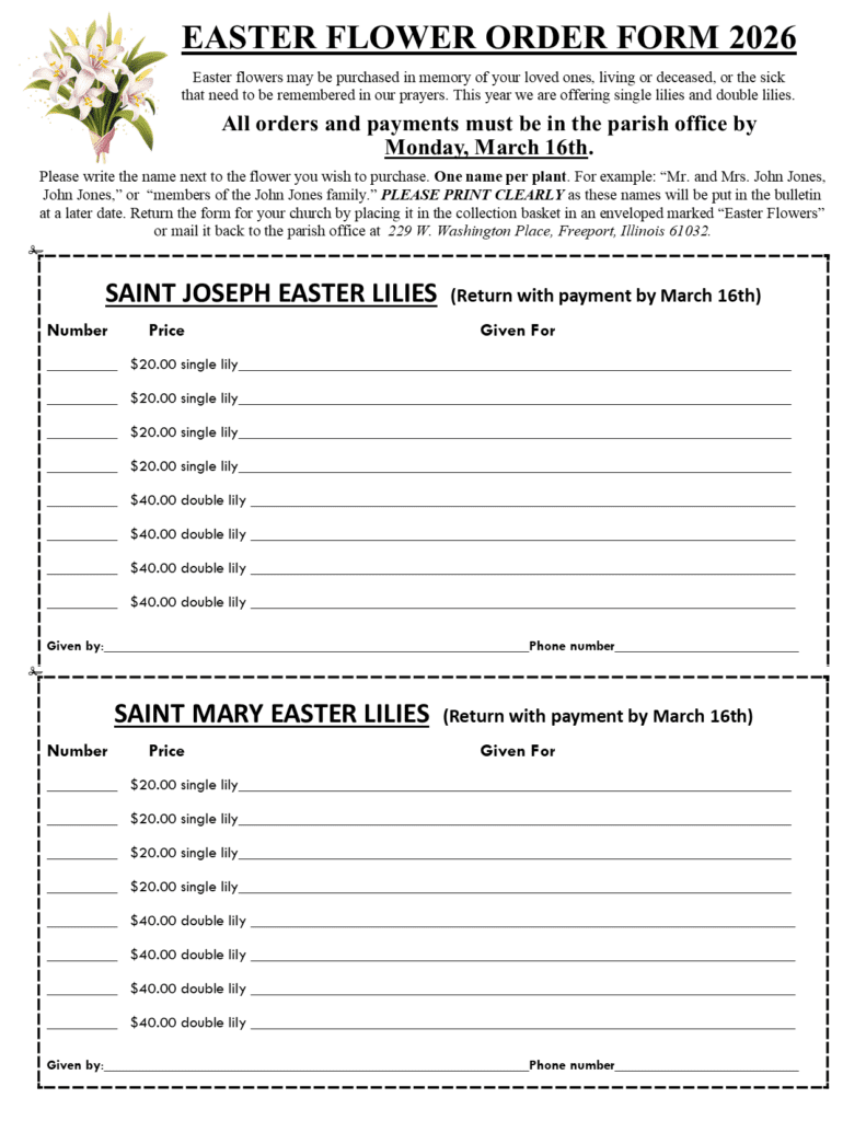 Talk with Fr. McMorrow or contact the parish office at 815-232-8271 for more information.