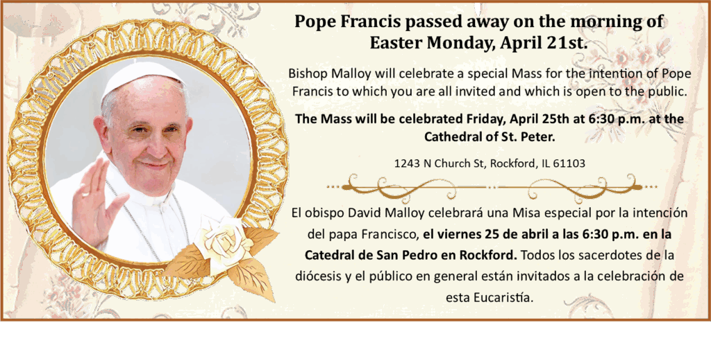 In light of the recent death, the Rockford Diocese is holding a special Mass for the intentions of Pope Francis on Friday, April 25th. 6:30pm at the Cathedral of St. Peter in Rockford.
